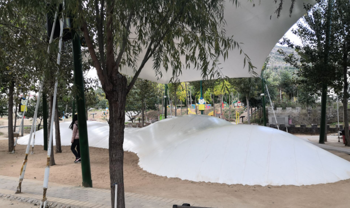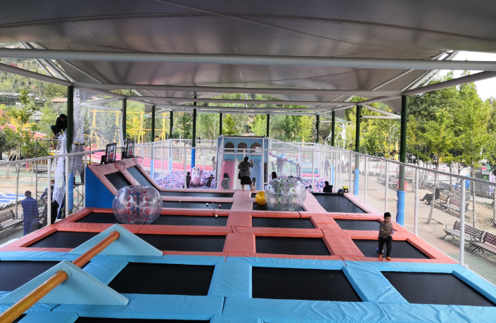 這套蹦床是今年做的,是一套戶外的蹦床,上面搭棚子,這個(gè)實(shí)物真的很漂亮。